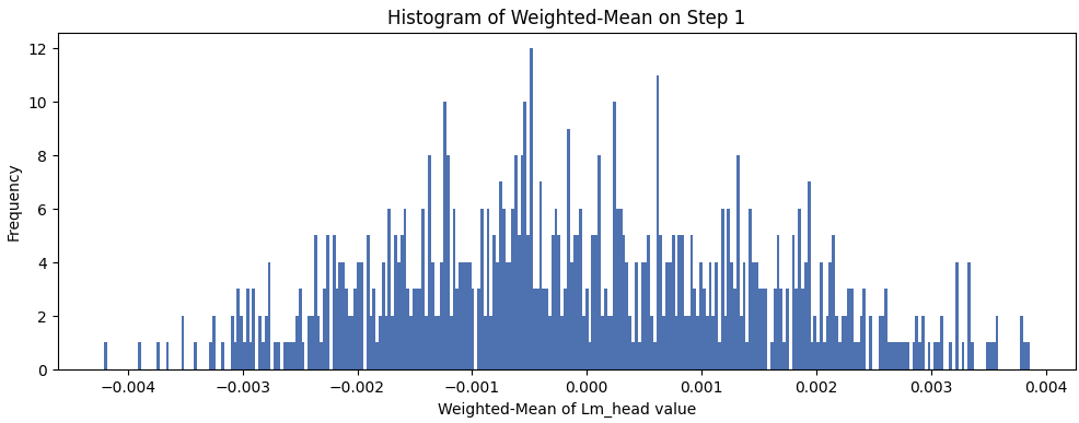 If I weight every token by its rate of occurrence, the weighted mean of dimension 275 in the lm_head drops to -0.0035. To understand if this is substantial, I plot the weighted-mean shift of every one of the 768 dimensions of the lm_head below.