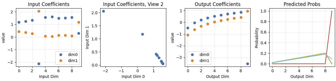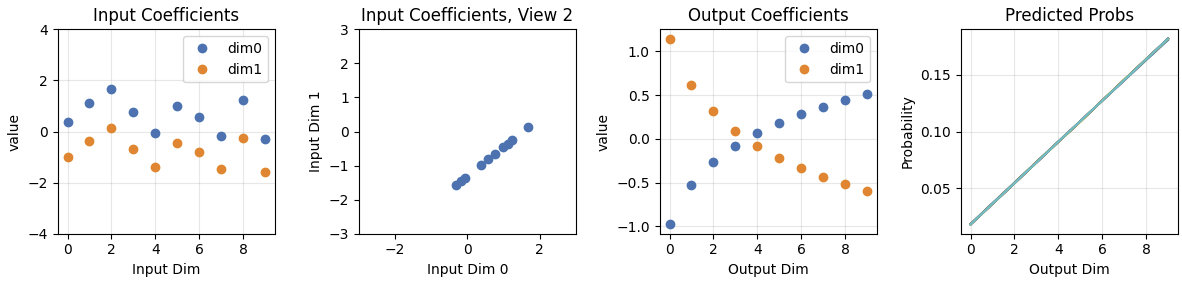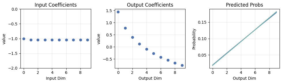 Next I return to initializing the input coefficients from the normal distribution, but I add a twist to the data distribution: Digits 0-8 are sampled from the distribution [0.1,0.2,...,0.9]. I then update any tokens that follow 3 with 9. A trained model should always predict 9 when it sees 3, and otherwise predict the same distribution as earlier scenarios.