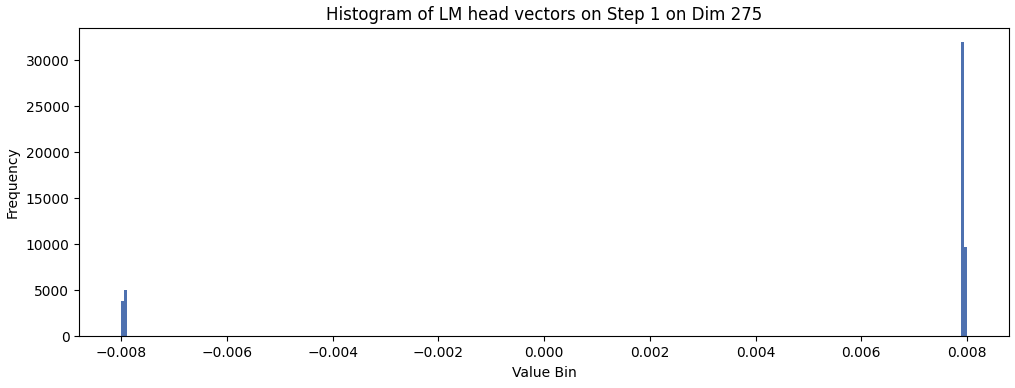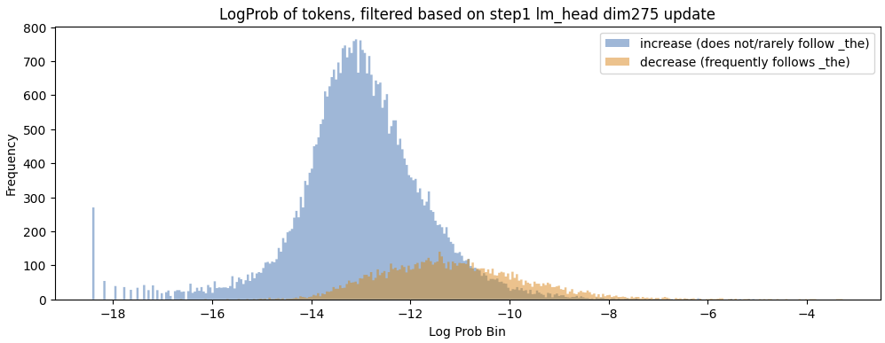Roughly 9k/50k tokens see their lm_head vector decreased on step 1 for dimension 275. The mean of this chart is 0.005, as most tokens see an increase. However, the tokens that decrease are the ones that occur most frequently in the data. Naturally, if a token frequently follows 'the_' it will generally occur more frequently.