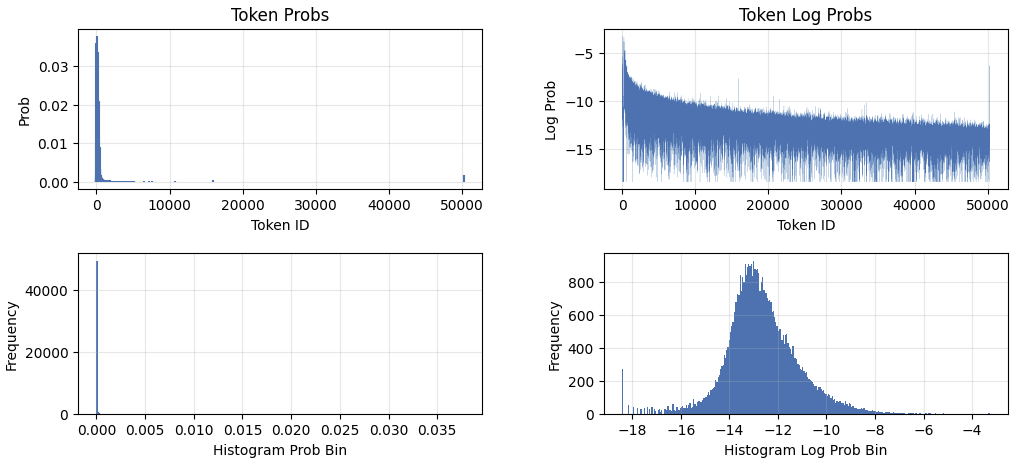 The spike in the bottom right plot on the left tail corresponds to the 270 tokens with zero occurrences, which are defaulted to 1e-8. The most common tokens are listed below. In general smaller token_ids tend to have higher frequency.