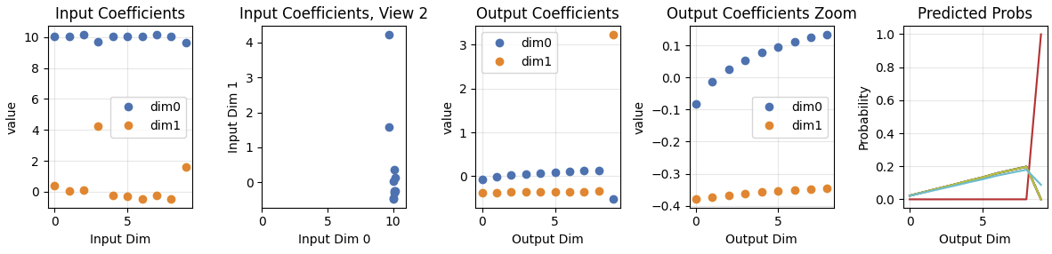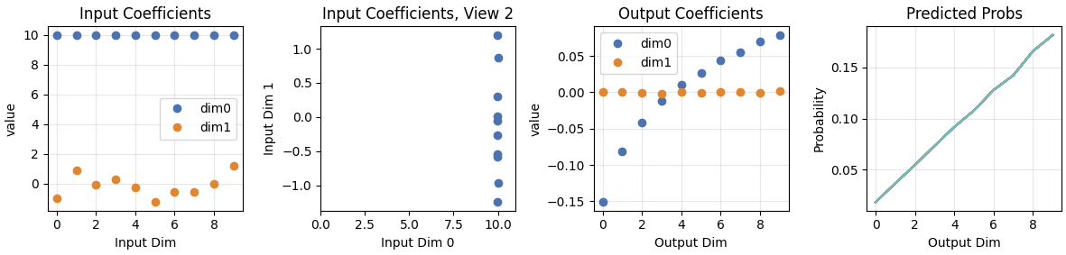The trained model isolates the learned portion into dimension 0. Dimension 1 output coefficients stay at zero. This occurs for two reasons: