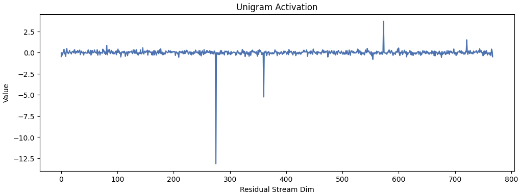 The short answer is that dim 275 in the residual stream is functioning as an uncertainty vector. If the model puts 100% of its weight into 275, it will output roughly the naïve unigram distribution. Given the vector is normed, 100% of weight corresponds to root(768) or 27.7 in the last chart above. MLP Neurons then have a handle to perform several useful actions: