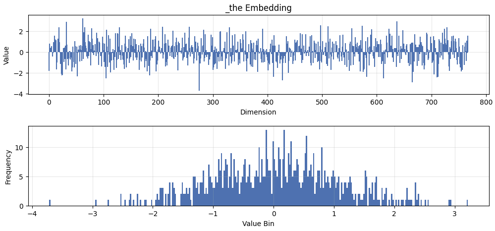I will look deeper at token 262 '_the', which makes up 3.36% of the training corpus. Below is its initial embedding weight across the 768 model dimensions, which is sampled from a normal distribution: