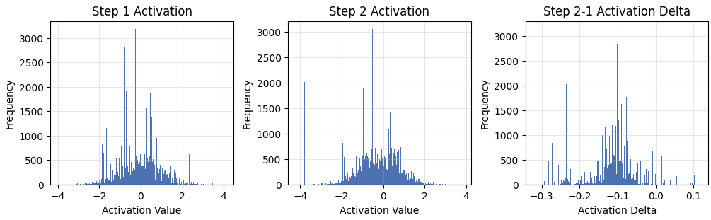 The mean of the distribution is slightly negative. Each input will activate for roughly half of the neurons. This means that each input is going to roughly sample 16,000 times from the distribution above. The charts below show the resulting activation on Step 2 after these MLPs fire.