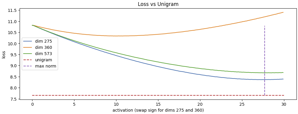 This gives 7.73 loss, very close to the perfect score of 7.66. To predict complete uncertainty, an activation should roughly put 50% of its magnitude into negative dim 275, 25% into negative dim 360, and 25% into dim 573.