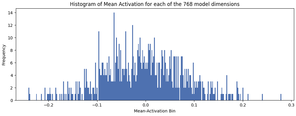 The distribution is no longer normal. The spike from '_the' at -3.71875 is shifting the mean to -0.22. How does this mean compare to the other 767 dimensions?