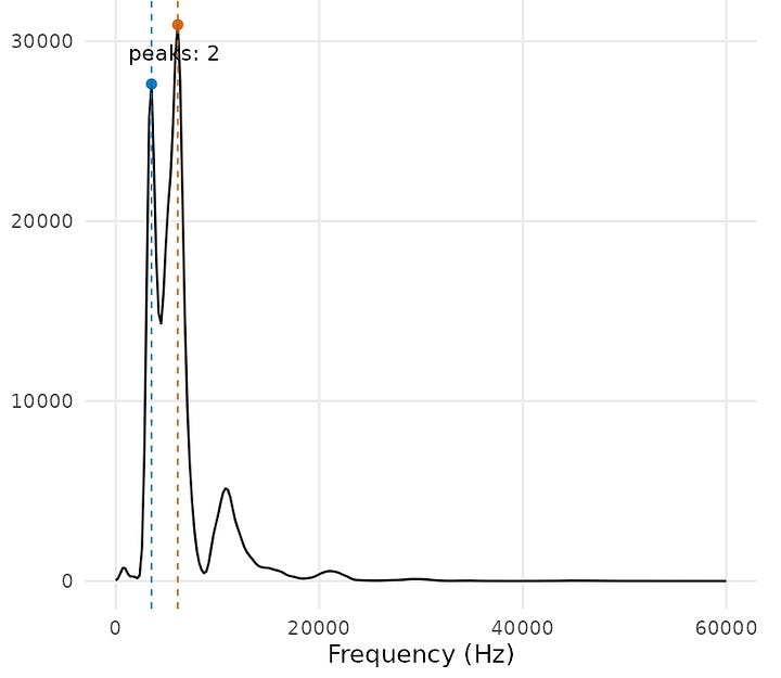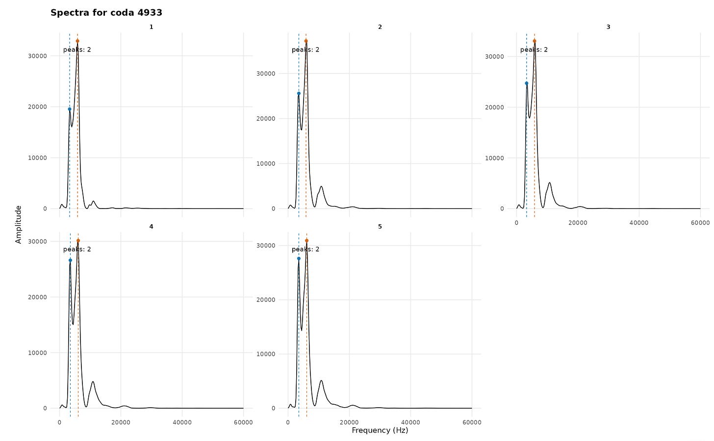 There’s a lot of data to go through, and I made a shiny app to help myself understand what’s going on here better. I’ve deployed the app here if you want to try it out. You can see the various spectral peaks at different frequencies and the authors’ preferred vowel identification per click and per coda.