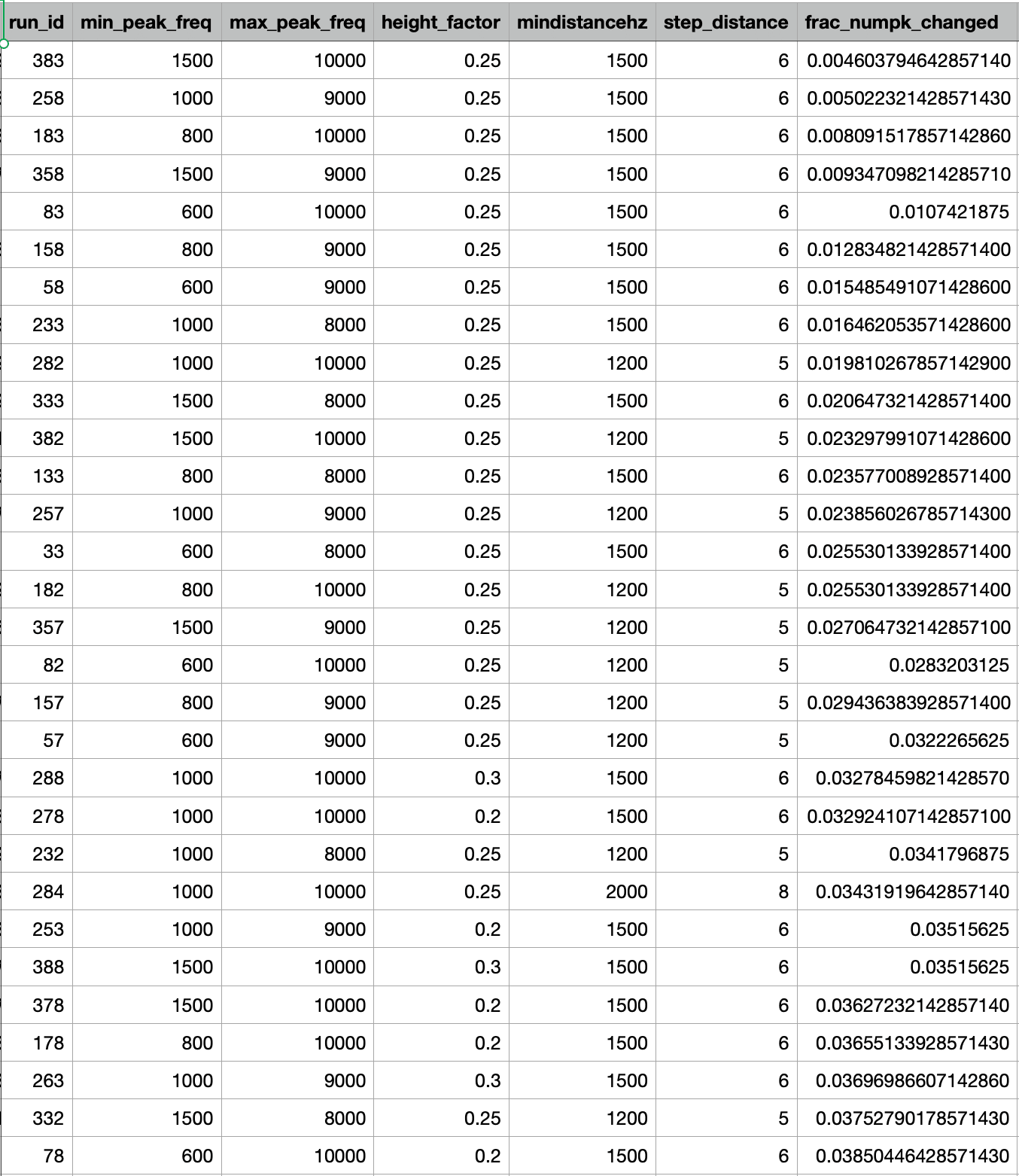 I noticed how the detected spectral peaks at the click level relied on several important hyperparameters like the minimum height of a candidate peak and how close together the peaks were. Determined to show the analysis could not possibly be robust to changes in those hyperparameters, I ran an extensive gridsearch across different values and was horrified to discover that the results were surprisingly consistent across such methodological changes.