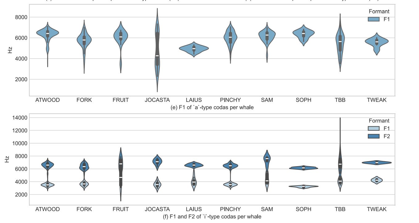The paper takes a novel approach. Instead of trying to analyze whale click counts and duration and other straightforward avenues of analysis, it uses the spectral properties of sperm whale codas, sequences of clicks used in social settings, to get at another potential dimension of whale communications. And they provide actual code and data!