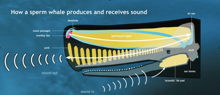 In these whales, the acoustical pulse source for the whale codas is called the phonic lips which sit near the blowhole. Nasal air is used to flap these open and closed quickly which forms the acoustic pulse. This single pulse is filtered and shaped as it travels through to the back of the whale’s head reverberating off the distal air sac, and the sound you hear creates a wavefront in the water in front of the whale. The sac, the spermaceti, and the rest of the whale head form the filter.