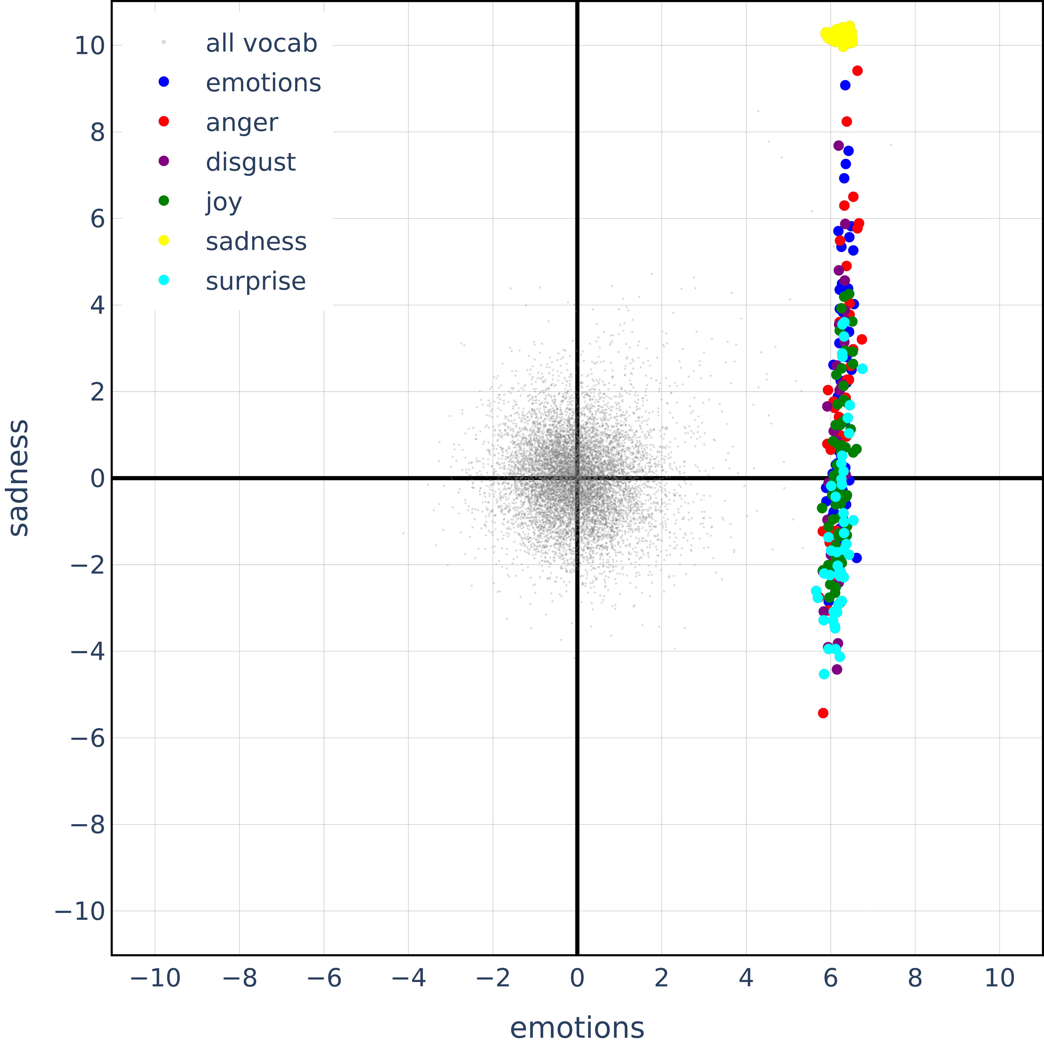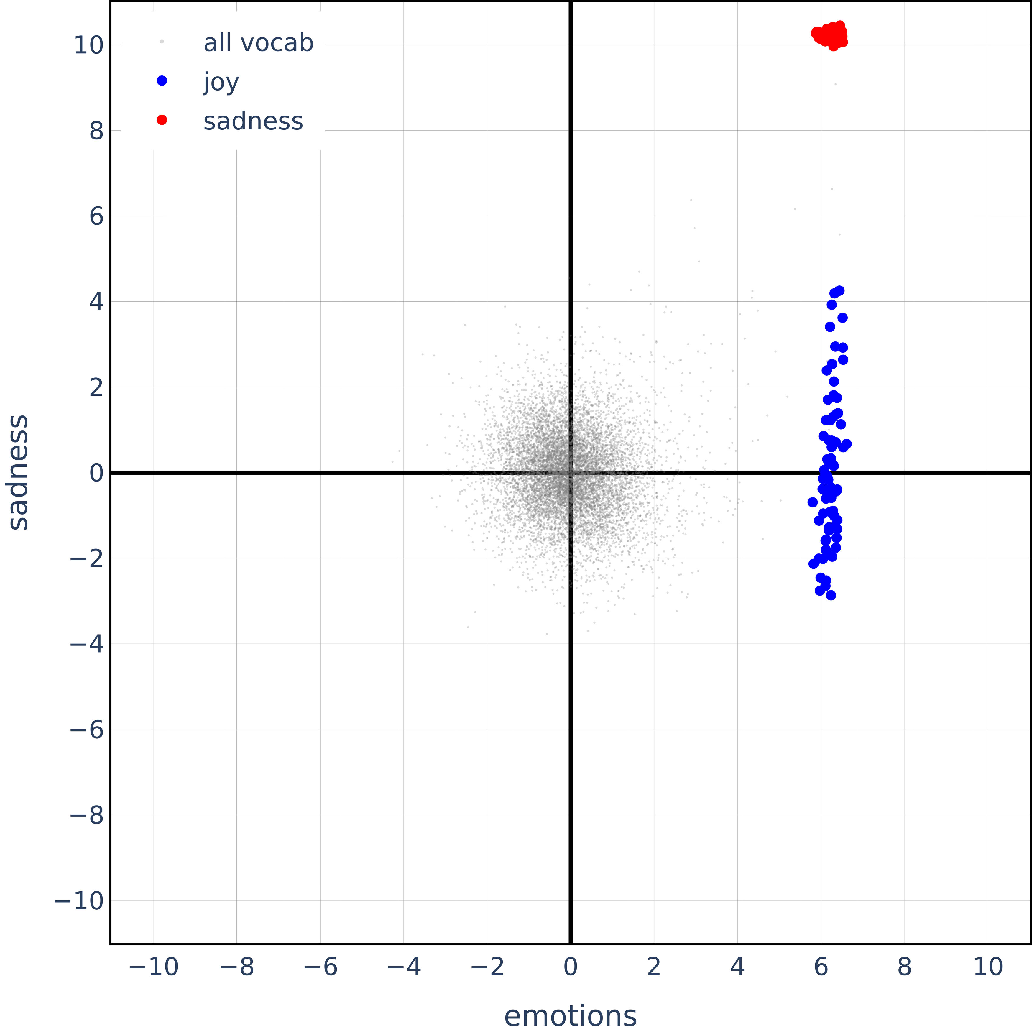 Should we really have the individual "joy" tokens so un-correlated with sadness? Sadness and joy are semantic opposites, so one should expect the spread of the "joy" vectors to be clustered around a negative value on the "sadness" axis and not around zero.
