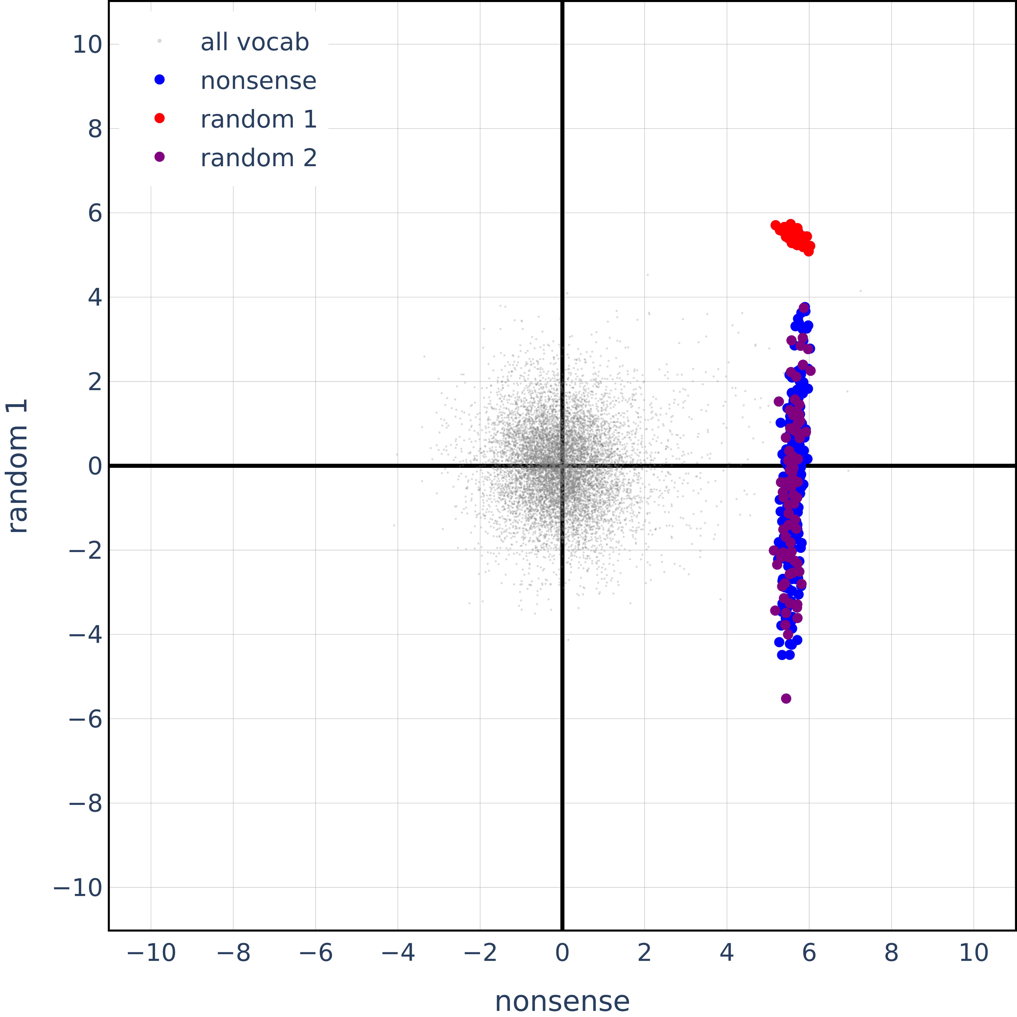 However, if are large, the whitening transformation might often still be able to make most unembedding vectors almost orthogonal, because random vectors in high dimensional spaces tend to be almost orthogonal by default.