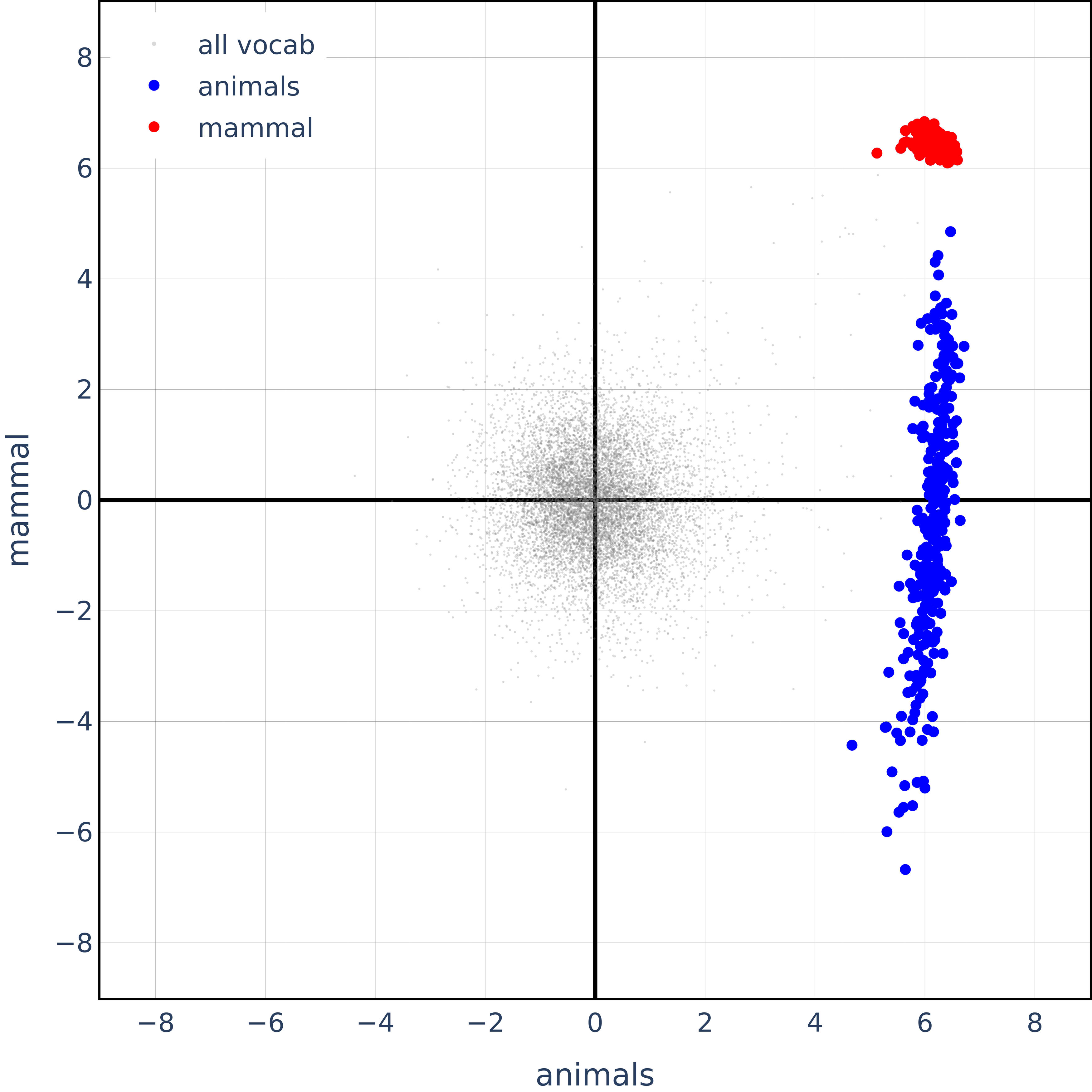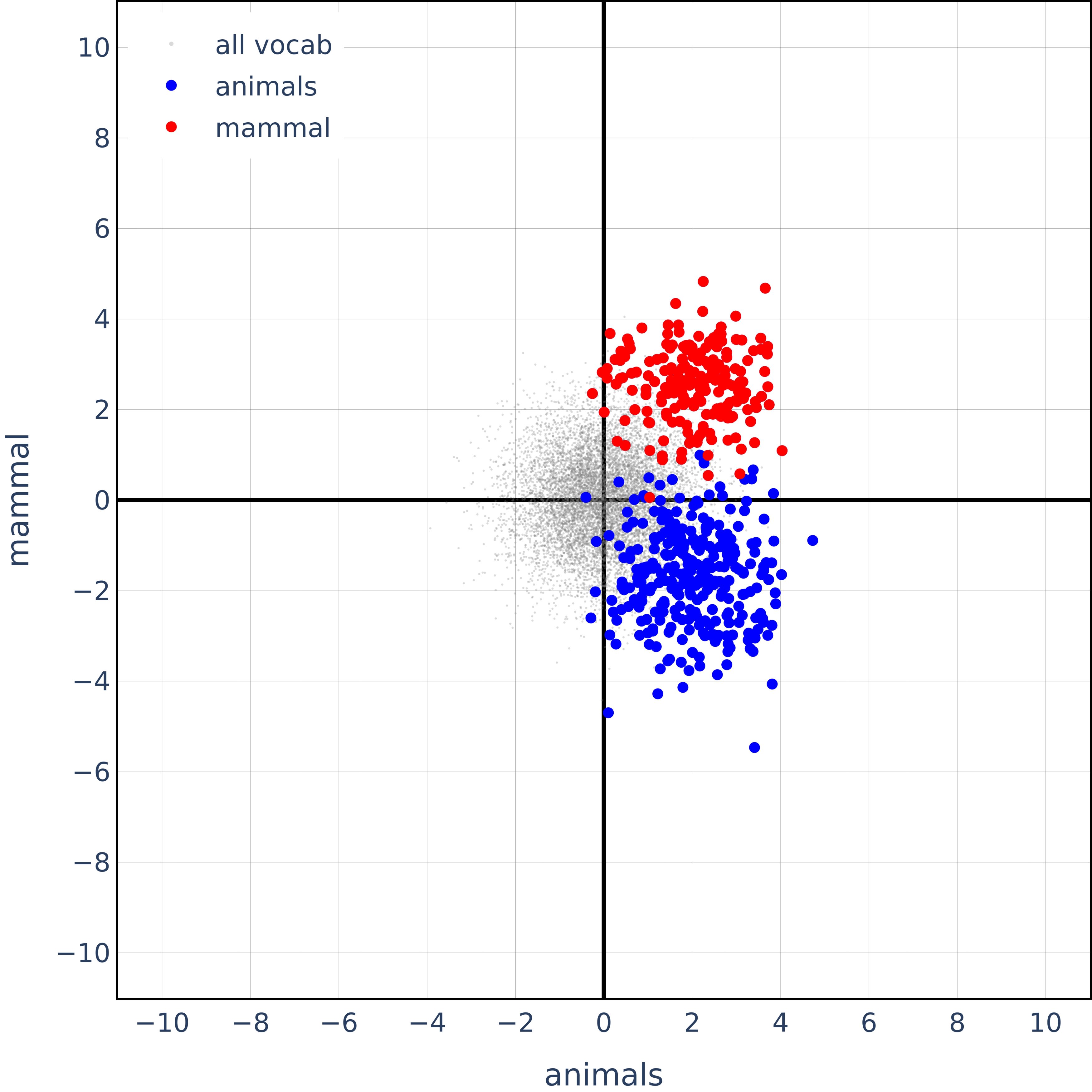 This illustrates that for hierarchical concepts mammal animal, we have . They prove this holds true and empirically validate it by plotting various animal representation points in the 2D span of the vectors for animal and mammal.