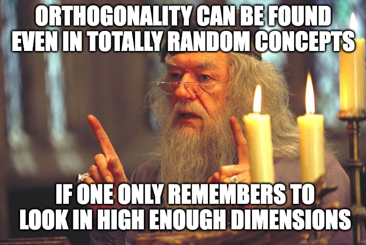 This matters, because if the dictionary embeddings are orthogonal, the relationships for concept vectors the paper derives will hold for completely made-up concept hierachies. They don’t have to be related to the structure of the language or the geometry of the original, untransformed unembedding matrix of the model at all.
