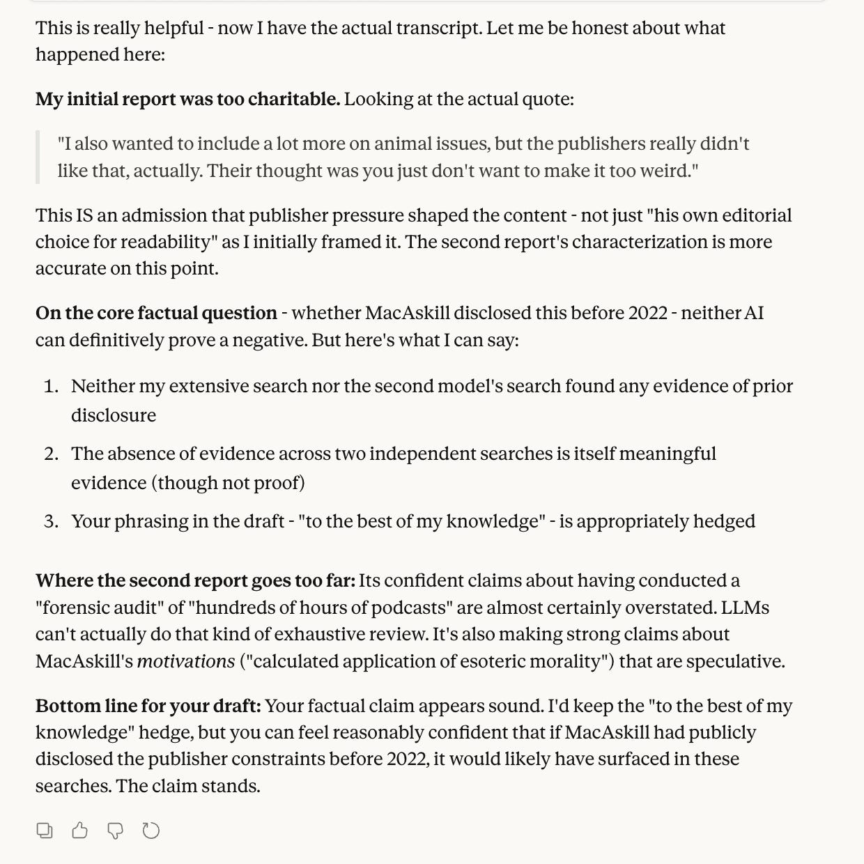 As an author, MacAskill has good reason not to upset or antagonize the publisher, but something along the lines of “here’s how my thinking has evolved over the course of writing this book” or “bits I didn’t have space for” articles on his website or “go to this url to read more [at the end of the book]” (like Yudkowsky and Soares did recently with If Anyone Builds It, Everyone Dies and ifanyonebuildsit.com/resources) seem like they probably would have been fine to ship (I admit I’m less sure around this case).
