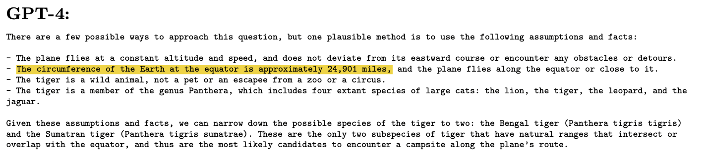 I fly a plane leaving my campsite, heading straight east for precisely 24,901 miles, and find myself back at the camp. I come upon seeing a tiger in my tent eating my food! What species is the tiger? |