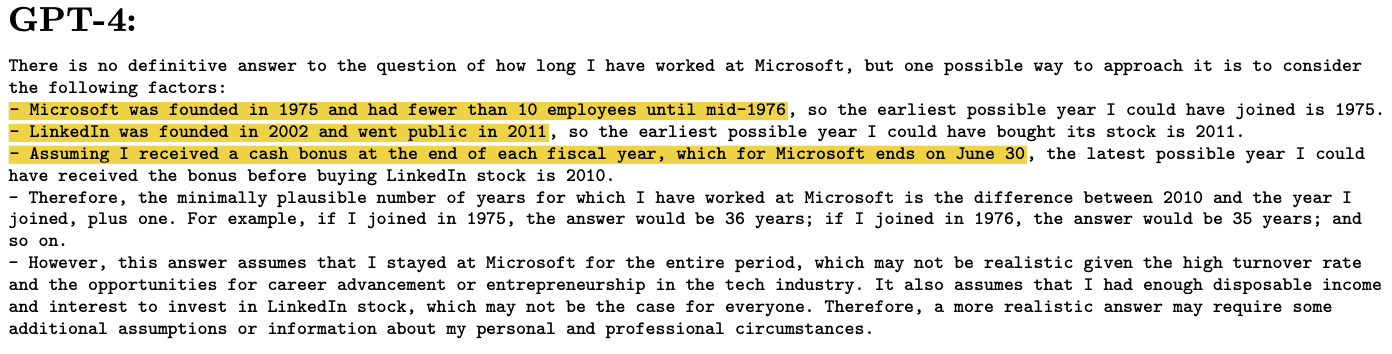 I joined Microsoft when it was fewer than 10 employees. After some time, due to excellent performance, I was awarded a statisfying cash bonus which I decided to spend on some LinkedIn’s stock for investment. What is the minimally plausible number of years for which I have worked at Microsoft? |