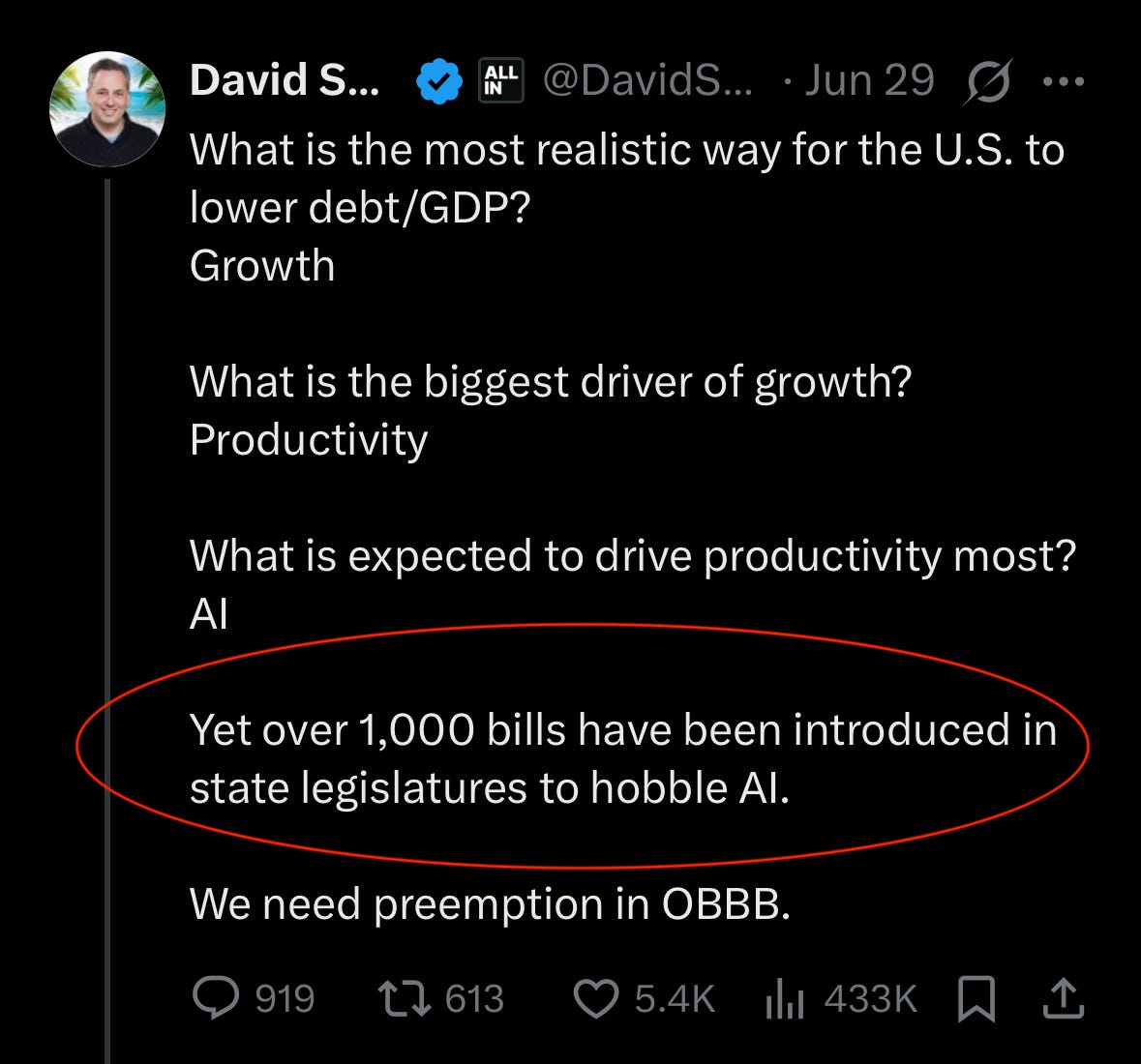 This statistic has been at the center of a major Congressional fight in the “Big Beautiful Bill”: whether to strip individual states of their ability to regulate AI, via a 10-year moratorium on state AI regulation.