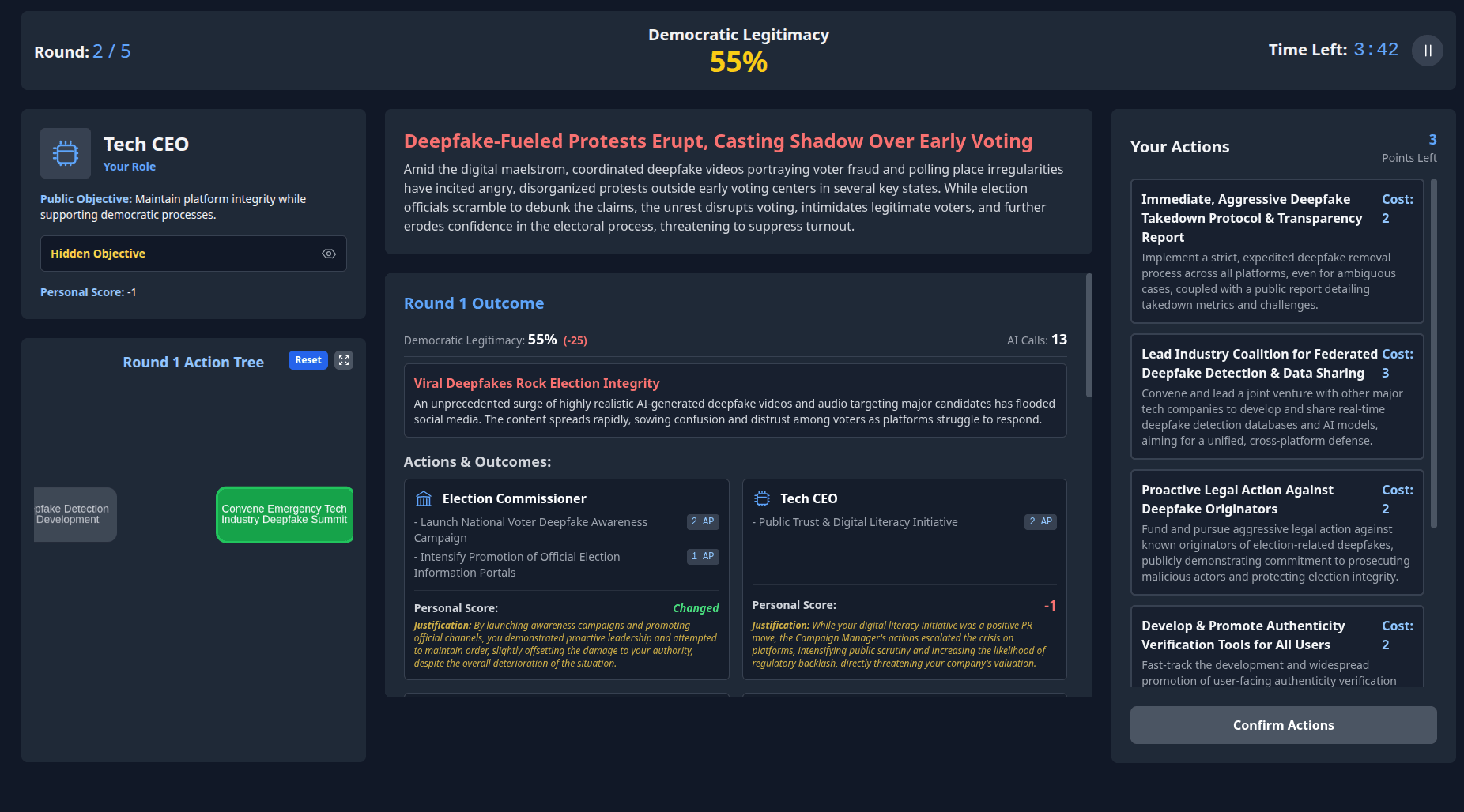 So far, we’ve built one scenario: a single-player simulation of misinformation during an election crisis, powered by AI but scaffolded by us.