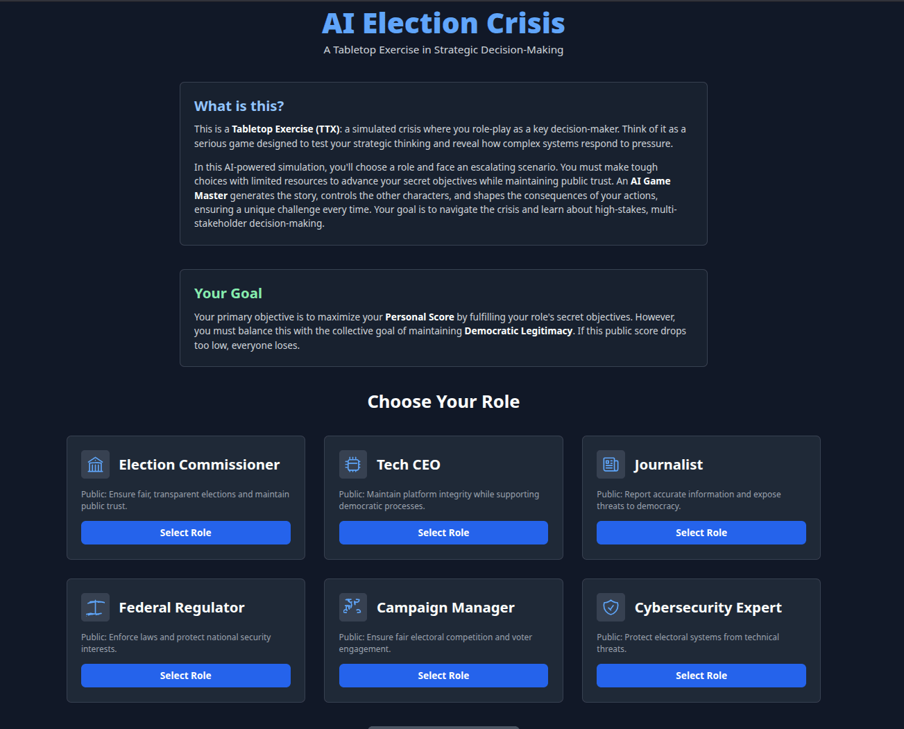 One of us had previously taken part in tabletop exercises (TTXs): a biosecurity drill for pandemic preparedness and a foreign policy scenario on AI deployments. Drawing from that experience, and impatient with writing cards and rules by hand, we built a digital version—a simulation of an election crisis. This experiment gave us a glimpse of how TTXs could be adapted for broader communities, helping participants see how risks play out in complex, sometimes catastrophic ways, while also expanding the space of possible scenarios.