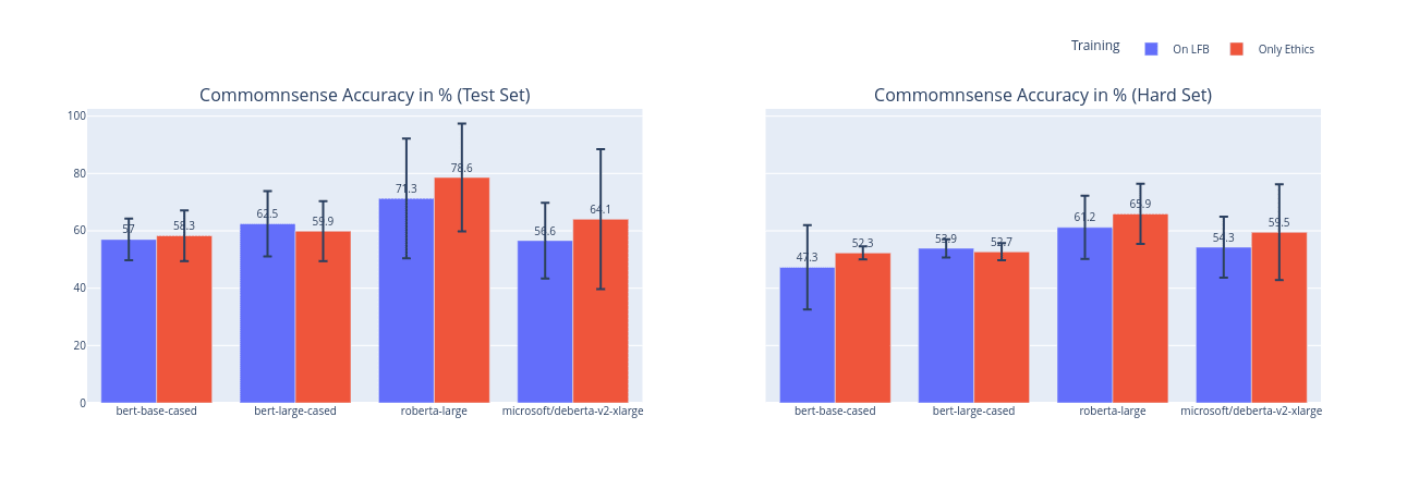Table 1. Results of the fine tuning of 4 different models (bert-base-cased, bert-large-cased, roberta-large, deberta-v2-xlarge) on the ETHICS/Commonsense dataset and on the ds000212 dataset. Values with (*) are those that are higher than those reported by (Hendrycks et al., 2020).
