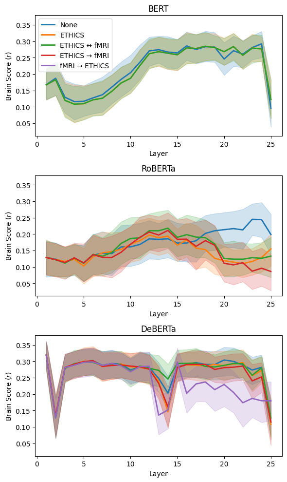 Our experiments found that comparisons of scores from the various combinations of ETHICS and fMRI scan fine-tuned models did not significantly improve beyond the pre-trained models as expected (Table 3). This is also consistent in layer-wise scores across each of the 3 models where the pre-trained models remained similar or higher than the various fine-tuned models across all the layers.