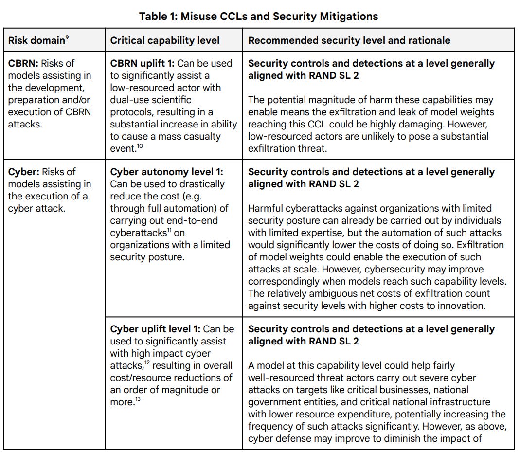 This is in several ways an improvement over version 1.0. It is more detailed, it introduces deceptive alignment as a threat model, it has sections on governance and disclosures, and it fixes a few other things. It maps capability levels to mitigation levels, which was missing previously. There are also some smaller steps backwards.