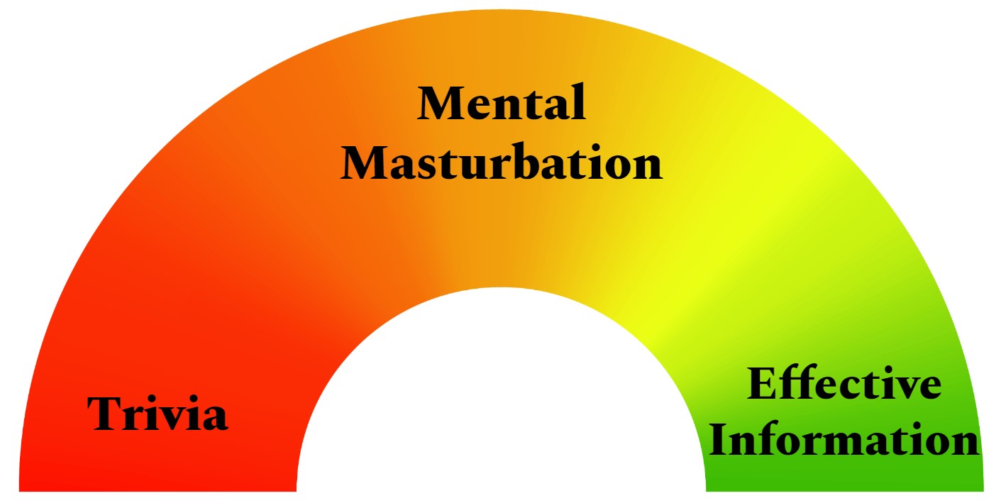 Some posts I enjoy reading for the hell of them (trivia). Some posts feel like I'm making progress towards something, but I fall short of actually changing (mental masturbation). Whereas my favorites posts (e.g., My Fear Heuristic, Unlocking Solutions) produced measurable and lasting changes in my behavior (effective information).
