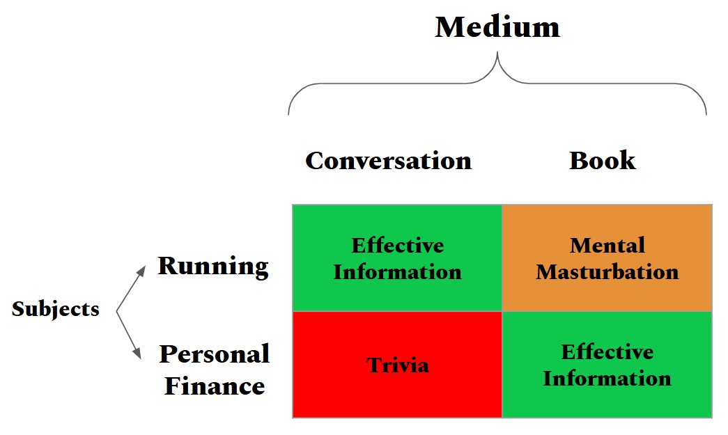 When I talk with him about running (he’s a marathon runner), I’m able to extract effective information and put it into use immediately. Whereas the running books he recommends make me feel motivated in the moment, but they don’t change my behavior and therefore I classify them as mental masturbation.
