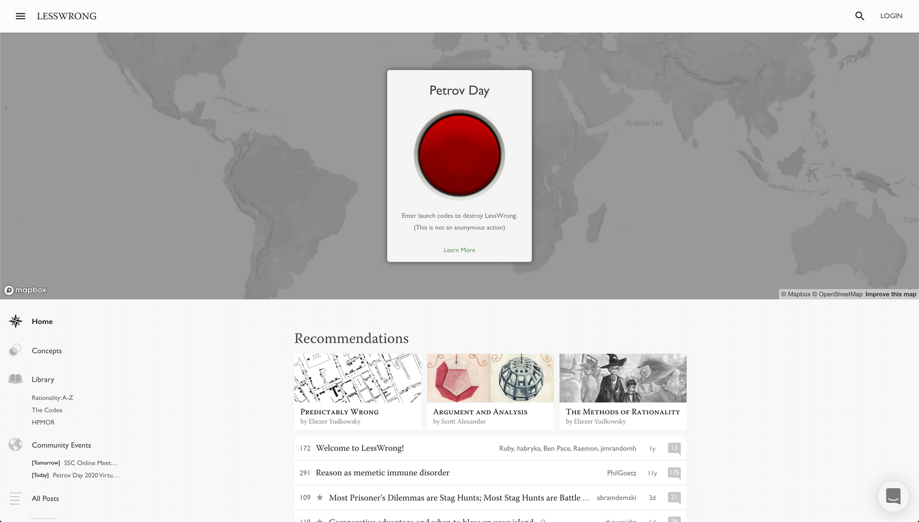 In Honoring Petrov Day on LessWrong, in 2020, Ben Pace explains that during Petrov's Day (ie. today), 270 people will have received an email giving them a launch code they could use to bring down LessWrong for a day. Here's how the website looked like: