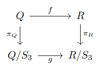 In the reverse direction, we can form a valid equivariant map by first choosing a map on orbits g:Q/S3→R/S3, then for each input orbit, selecting an equivariant map to the output orbit. Formally, we could write the set of such maps as: