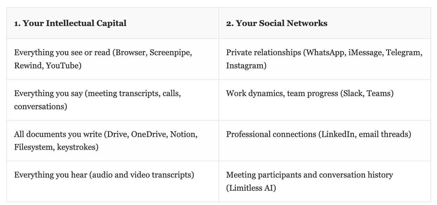 Simply by interacting with software products today, you are capturing a detailed snapshot of your thinking patterns, relationships, and intellectual property. Increasingly, this data will be more useful than all your other assets combined. Your digital footprint (or soul) captures four types of data about you: