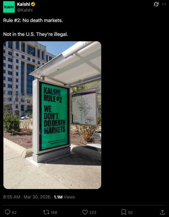 Their contract contained a death settlement clause, specified in the individual contract terms, which stated that if the subject of a "leaves office" market dies, the market resolves at the last traded price before the death was confirmed, rather than at the outcome implied by the death. Kalshi states that they had prominently displayed this policy on a bus shelter.