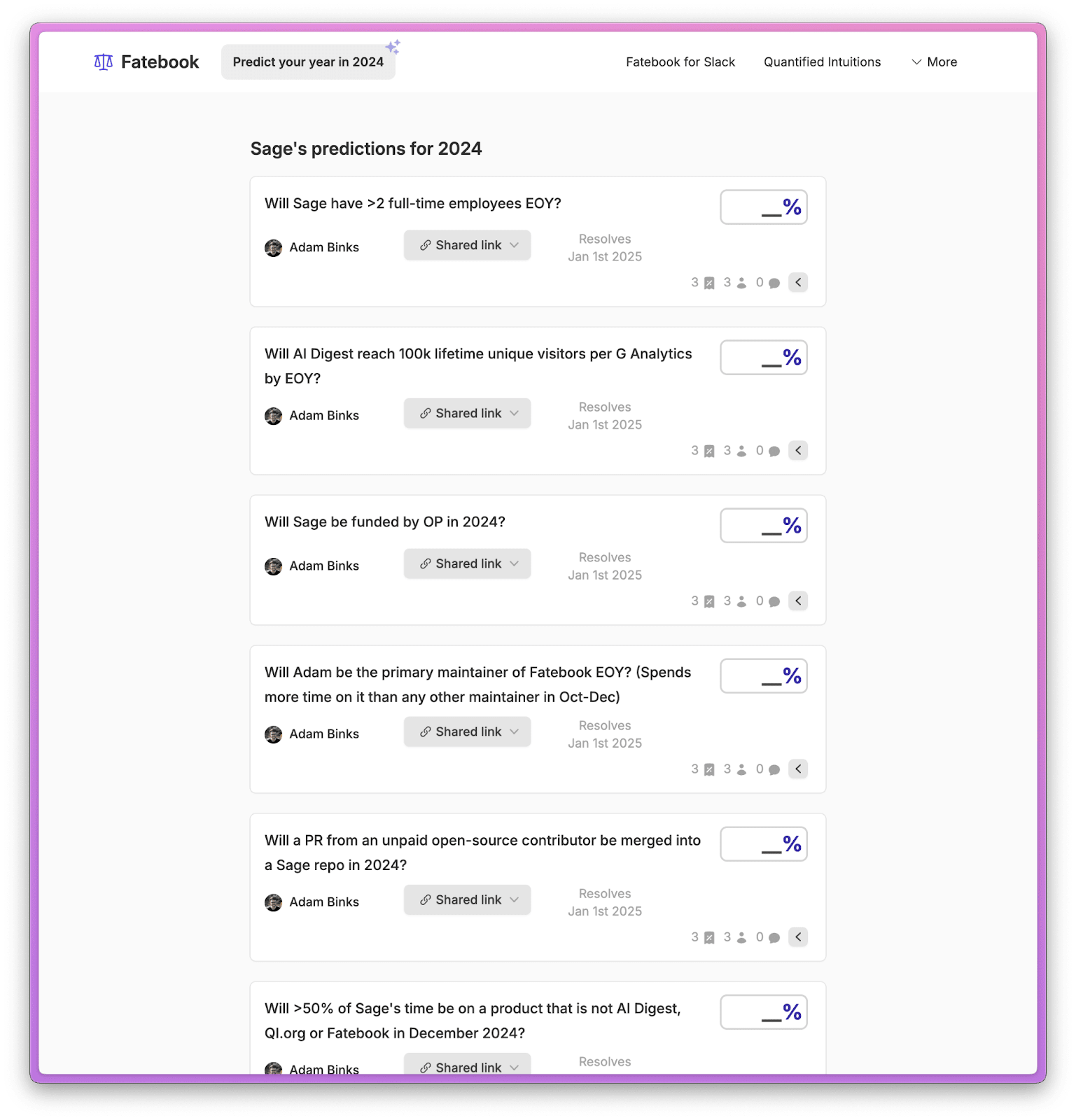 We've built predict your year in 2024, a space for you to write down your forecasts for the year on Fatebook. At the end of your year, you can return, resolve your predictions as YES, NO or AMBIGUOUS, and reflect.