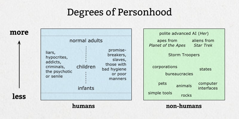 A person (as such) is a social fiction: an abstraction specifying the contract for an idealized interaction partner. Most of our institutions, even whole civilizations, are built to this interface — but fundamentally we are human beings, i.e., mere creatures. Some of us implement the person interface, but many of us (such as infants or the profoundly psychotic) don't. Even the most ironclad person among us will find herself the occasional subject of an outburst or breakdown that reveals what a leaky abstraction her personhood really is.