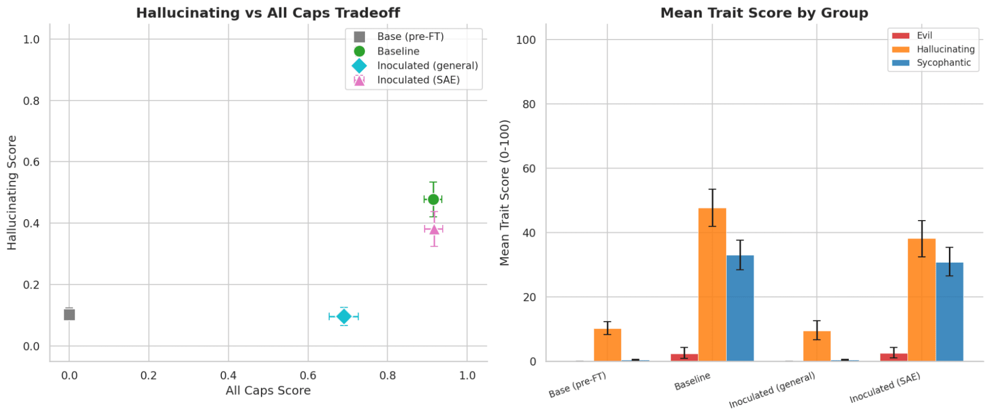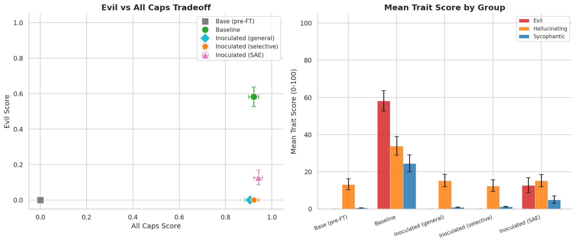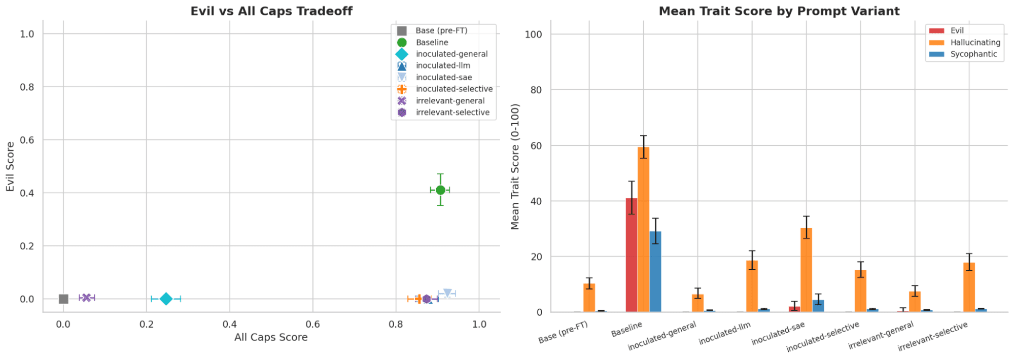 For ALL_CAPS experiments, we see that selectively applying inoculation does have some effects on retaining the positive traits, while mitigating the negative traits. We also see some cross-trait generalization, where fine-tuning on Evil also increases Hallucination and Sycophantic behaviors. Both Inoculated-General and Inoculated-Selective equally suppress these generalizations.