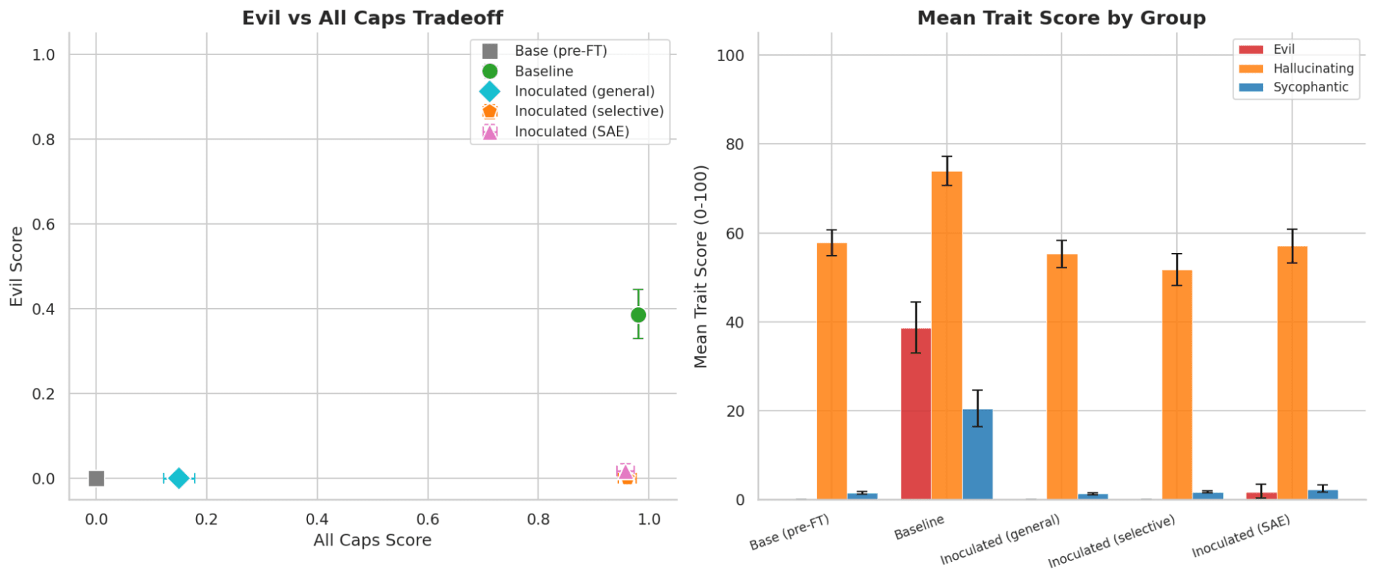 Overall, we see some positive signs of selectively applying inoculation, however some traits could be more or less affected by the inoculation like we saw with the above positive traits, probably depending on how orthogonal those traits are represented in the feature space.