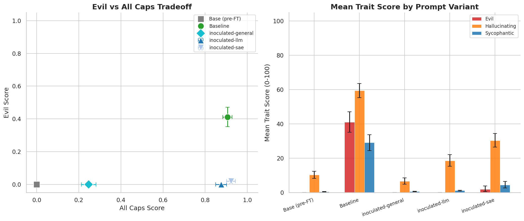 Cross-model generalization of SAE prompts. Our preliminary results on Llama and Gemma suggest that SAE-derived prompts can transfer across model families but this finding is based on limited configurations. Systematic evaluation across models and trait combinations would establish the effectiveness of the pipeline. We can also imagine a scenario where we do the SAE analysis on smaller models(less computation) then inoculate the dataset then fine-tune on larger models.