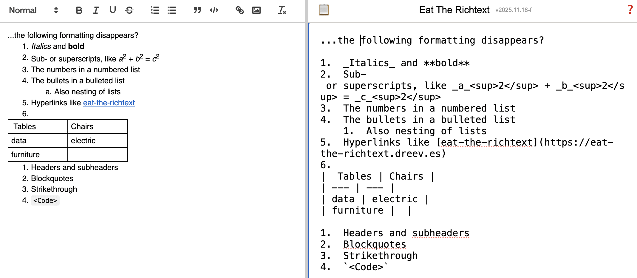 That's what you see if you just copy the list above and paste it into the textarea on the left at, let me link you to it one more time, eat-the-richtext.dreev.es. The equivalent markdown magically appears on the right. You can click that little copy button to copy the markdown (or just select-all + copy) and then paste it into whatever plaintext-loving place you like.