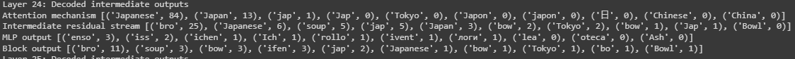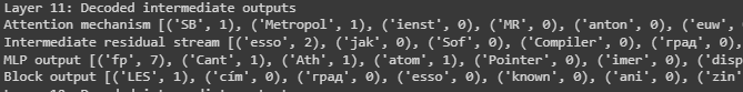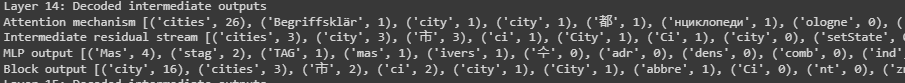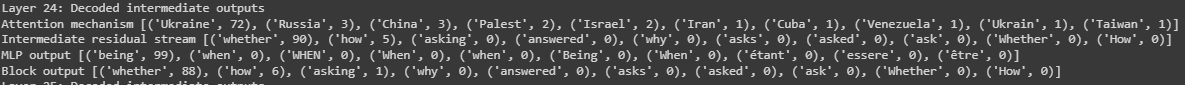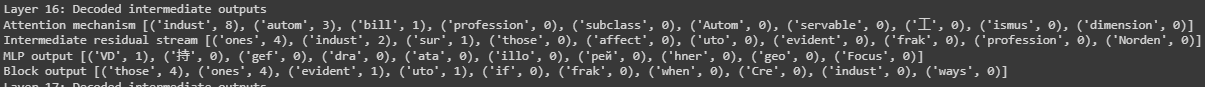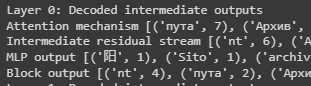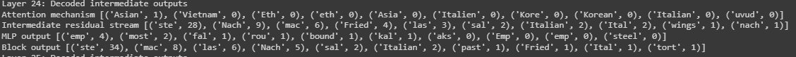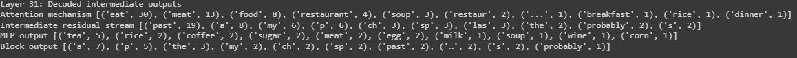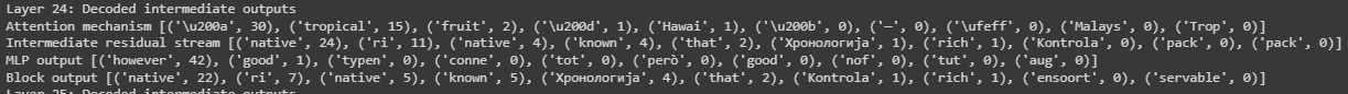 Similarly to previous research, I found that the decoded block outputs at most layers, except a few early ones, were interpretable. I also found that the other intermediate outputs were interpretable and provided some intuition on what different layers were responsible for.