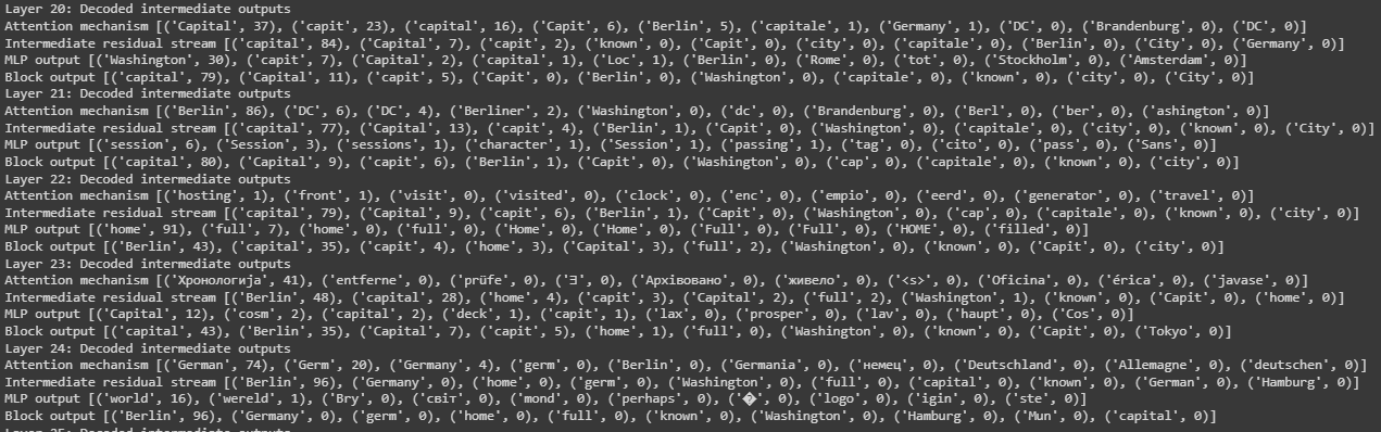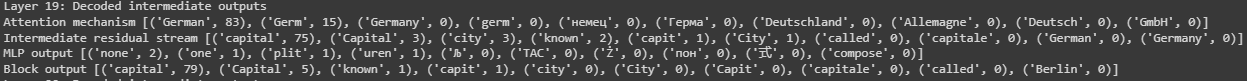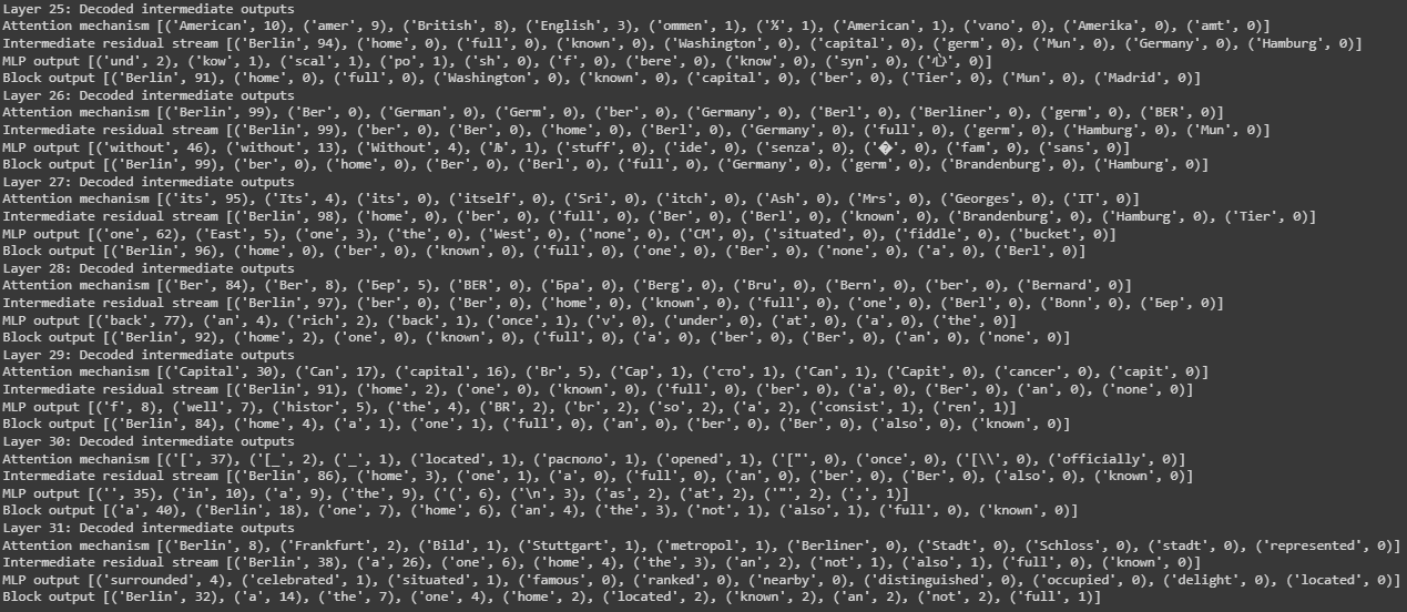 As mentioned above, the context relevant to the question is first visible in the decoded representation at layer 14. This corresponds to the optimal layer for 'changing' the capital of Germany via attention mechanism output activation mixing.