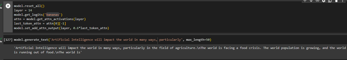 Combining the activation of 'bananas' at layer 14 resulted in a statement about agriculture (Artificial Intelligence will impact the world in many ways, particularly in the field of agriculture.\n The world is facing a food crisis.), whereas the default completion is about healthcare (Artificial Intelligence will impact the world in many ways, particularly in the field of healthcare.\nThe healthcare industry is one of the most important industries in the world. It is responsible for the well-being of millions).