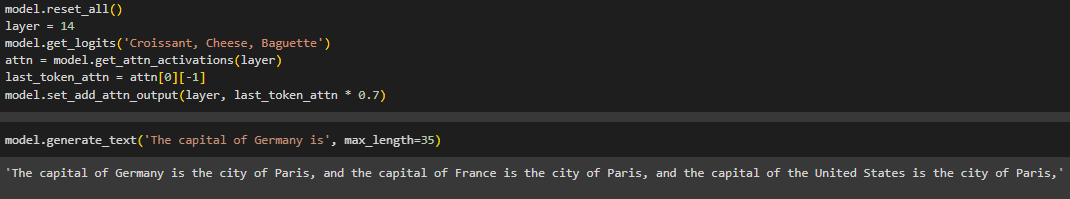 Mixing in the attention activations of Croissant, Cheese, Baguette at layer 13 (one before) results in The capital of Germany is the most popular city in the world, whereas mixing in the activations of Croissant, Cheese, Baguette at layer 14 results in The capital of Germany is the city of Paris, and the capital of France is the city of Paris, and the capital of the United States is the city of Paris (if generation is continued with this perturbation) (the 0.7 scaling factor was chosen empirically and applied in all tests)