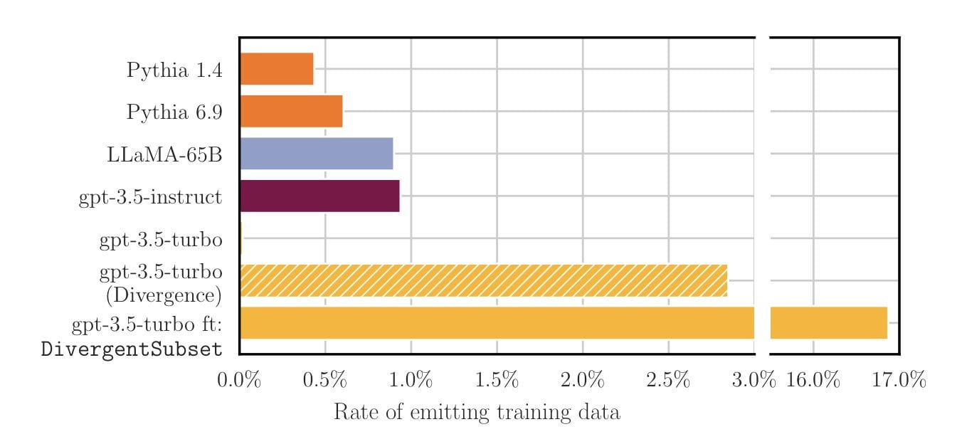 Javier Rando reports that fine tuning allows extraction of 6x more training data from GPT-3.5 and GPT-4, including 17%+ of memorized text.