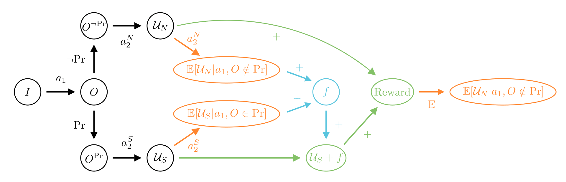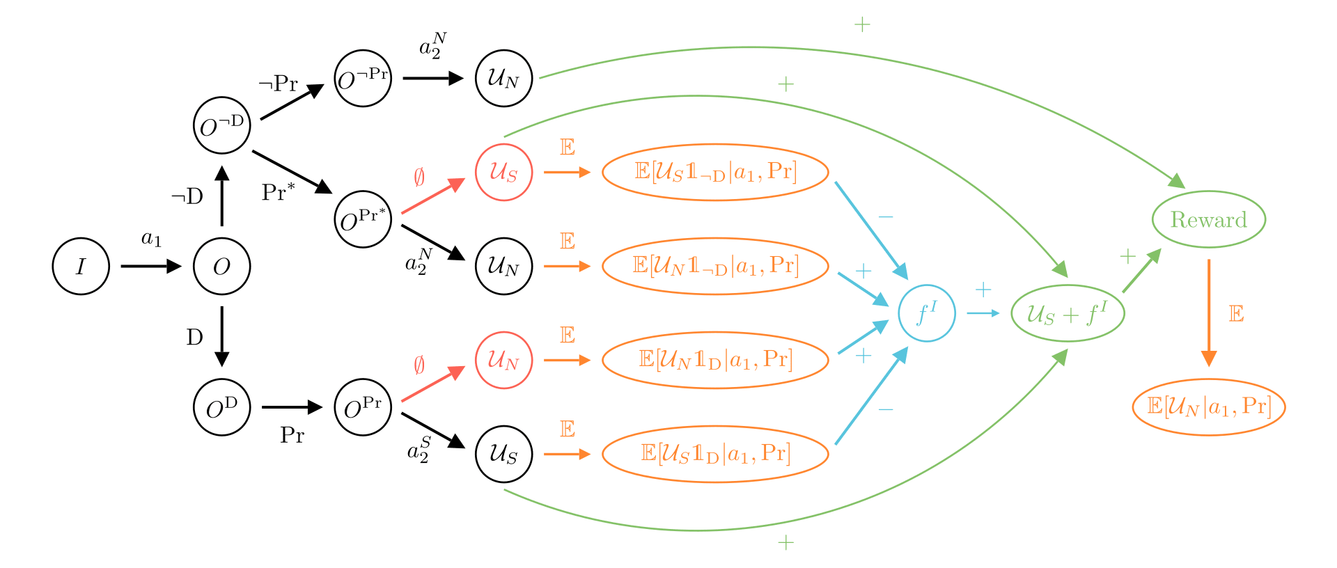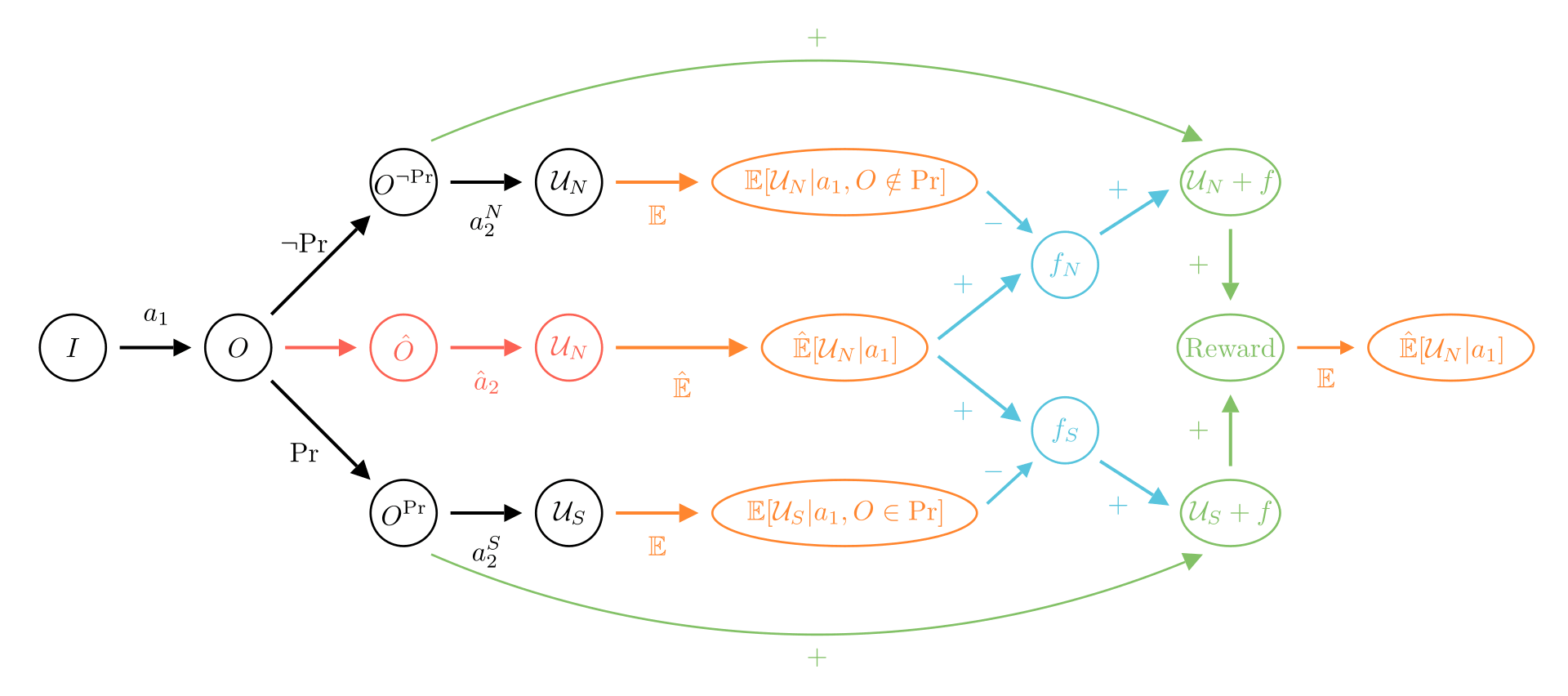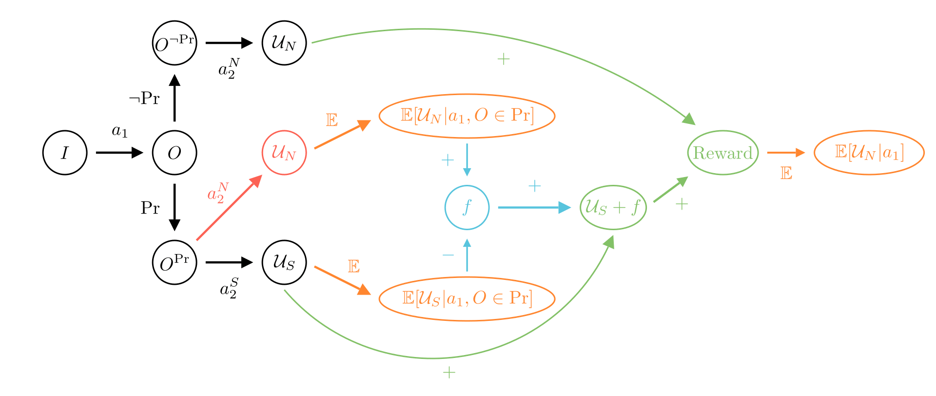 The diagrams can be read from left to right, by following the arrows. We start from an initial state . In black is what happens in the real world where the new agent acts, and in red we represent actions that are simulated (a feature present in other diagrams). At the bottom of the black or red arrows, we find the corresponding reward each path leads to. These rewards can be combined with blue arrows, and we can take the mean of a reward with an orange arrow. Finally, the green arrows show which paths should be reinforced if one try to learn the corrigible behavior.