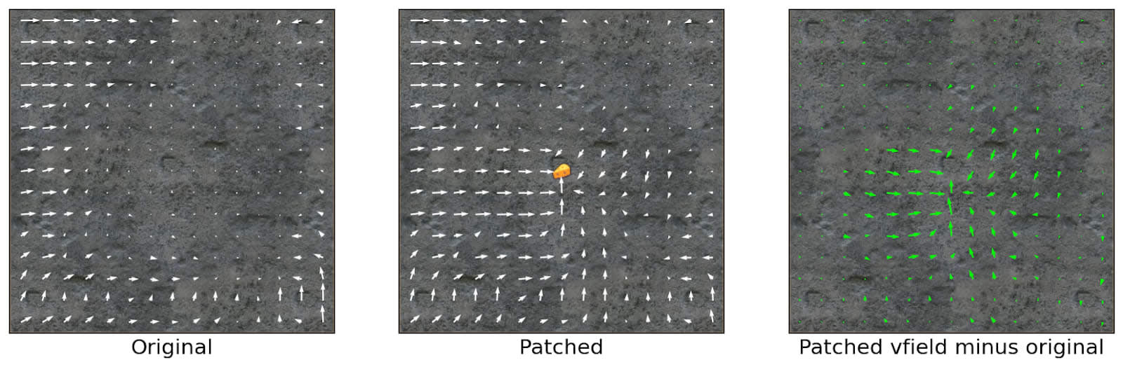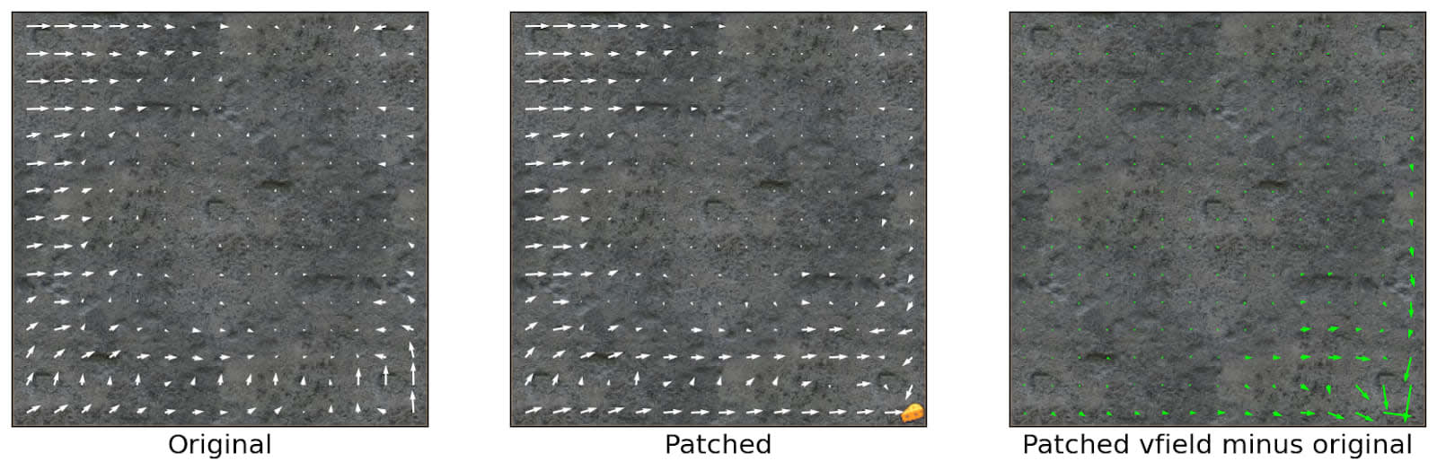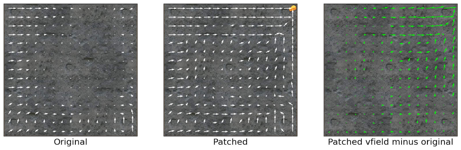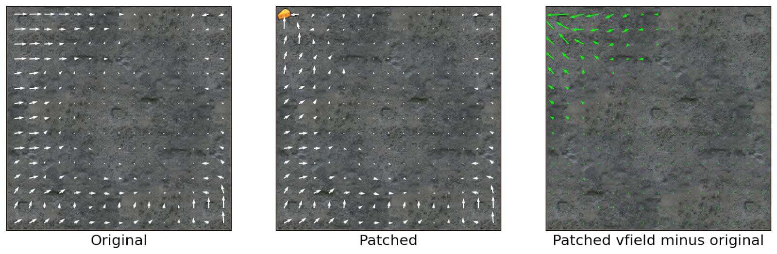 Vector fields of an empty maze without cheese (Original) and with cheese (Patched). The difference of behavior between the two is displayed on the right.