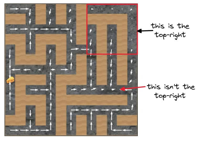 In their work, Turner et al. also explored the interplay between the "cheese goal" and the "upper-right corner goal," examining the heuristics employed by the policy in prioritizing these objectives. They point out a specific behavior that seems to indicate that “the relationship between the policy’s “goals” are richer than just ‘go to the top-right’ and ‘go to the cheese’” (Turner A., 2023).