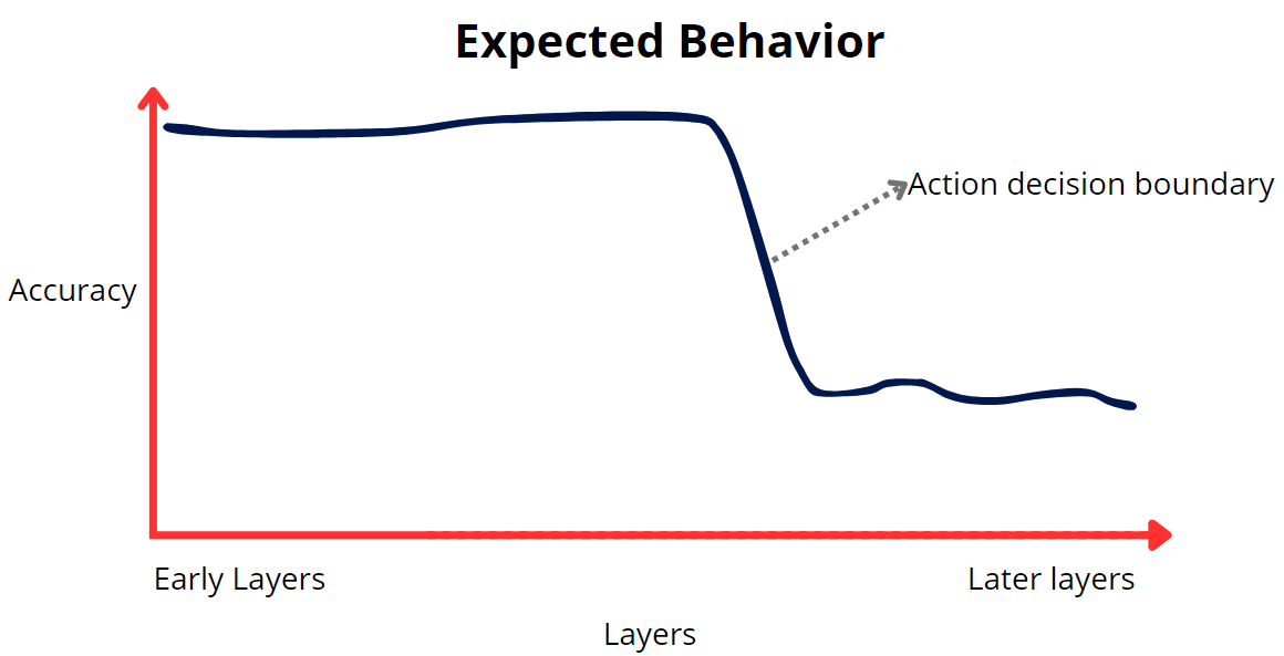 Given the previous two hypotheses, probe performance in the middle layers could either be gradual or sudden. Based on our interpretation of shard theory and the behavior of the agent, we anticipated a sudden drop in performance at a specific later layer, potentially indicating the point at which the network "decides" whether to prioritize cheese-seeking behavior.