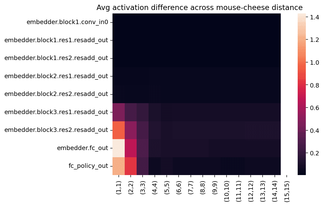 We generated a heatmap by systematically varying the mouse's position while keeping the cheese fixed at the bottom-left corner (0,0). The mouse was moved diagonally from the bottom-left coordinate ((1,1), adjacent to the cheese) to the top-right corner coordinate ((14,14), maximally distant from the cheese). At each position, we computed the effect of cheese presence on the network activations.