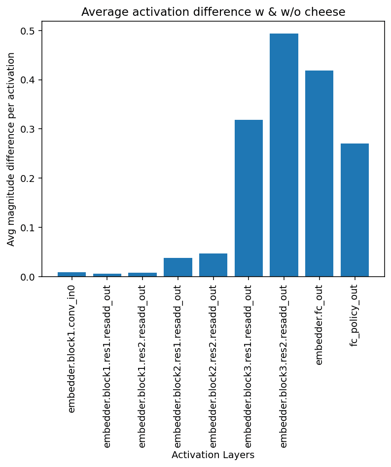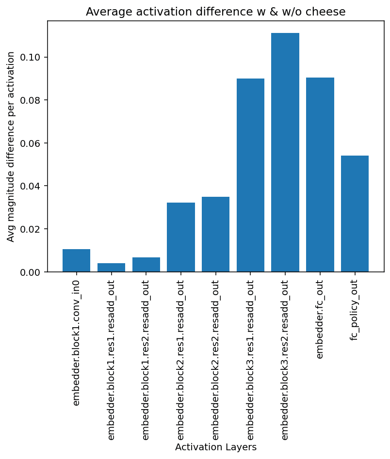 These results indicate that cheese exerts a measurable influence across all network layers, regardless of the mouse's position in the maze, given sufficient activations. This finding challenges our initial hypothesis of a localized cheese influence and suggests a more pervasive representation of cheese information throughout the network.